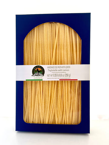 Mia Emilia's Tagliatelle with Lemon is a fine egg pasta produced in the Marche region of Italy. This brightly lemony, aromatic pasta is made from the same egg pasta recipe as the regular tagliatelle with the added essence of Sicilian lemons. This pasta is excellent in the summer with a chilled white wine. Try it with pasta recipes such as pasta al Simone, with simple recipes using only a little bit of olive oil and lemon with artichokes or asparagus, with summer vegetables like squash and zucchini, or with fish dishes with white wine and capers. Cook time 4-6 minutes.
