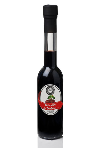 Black Cherry Balsamic Condiment is an excellent blend of traditional balsamic condiment and real black cherries. It is sweet, a little sour, and full of cherry flavor. Made with cooked grape must, 49% cherry juice, and wine vinegar, the color takes on a deep reddish-purple shade. This is excellent over a salad, with cheeses, meats, or on top of gelato, cakes, cheesecakes, and other desserts.